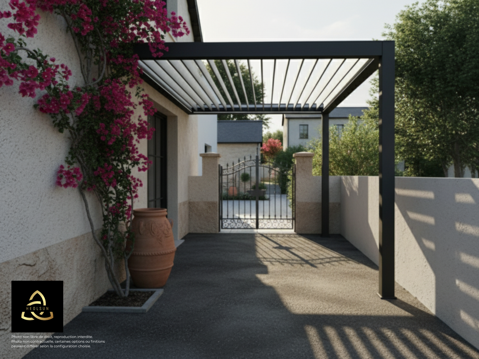 Adossée à votre mur, la pergola est livrée avec des lames parallèles uniquement, ce qui permet une intégration élégante et efficace, sans surcharge visuelle.